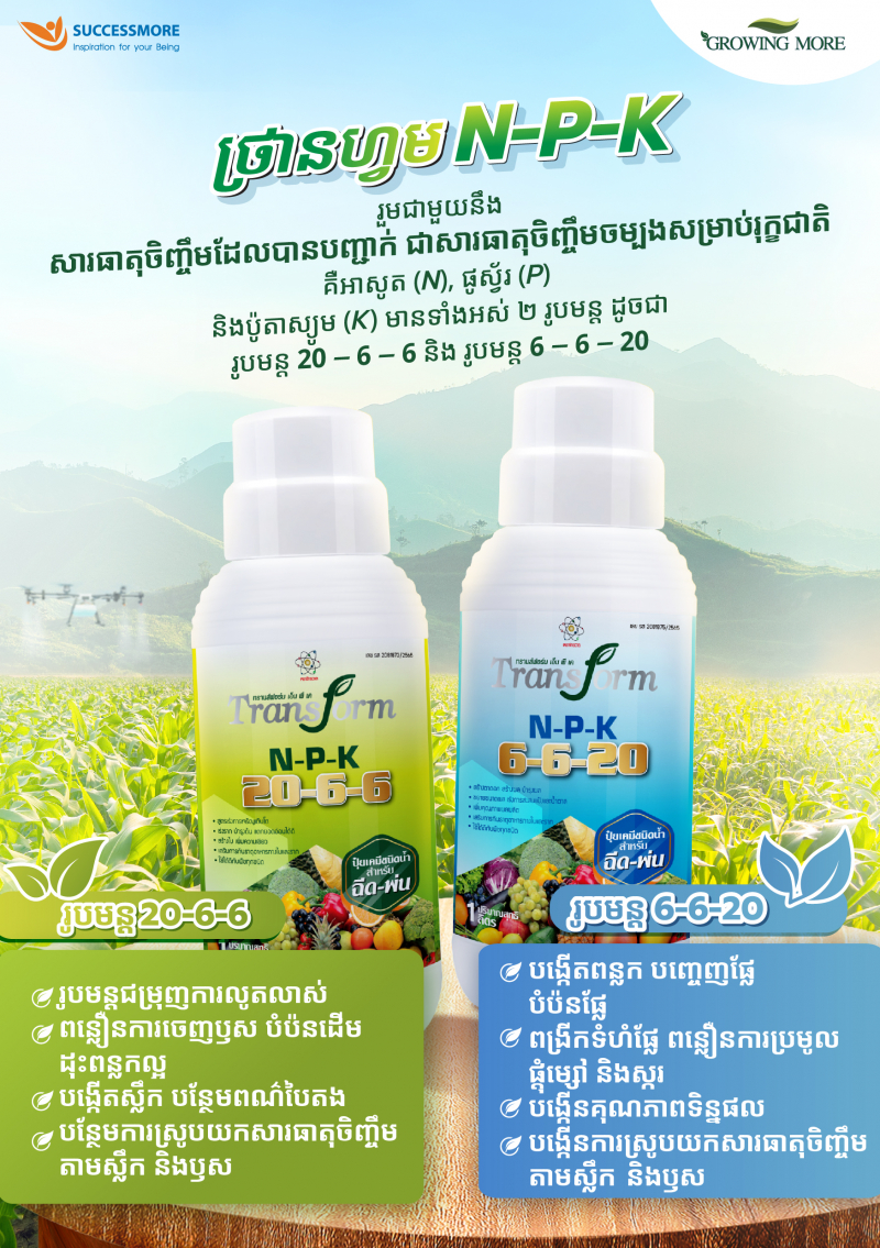 Transform N-P-K, primary plant nutrients include nitrogen (N), phosphorus (P), and potassium (K) Formula 20 – 6 – 6 : Grows rapidly, enhances soil microbial activity to increase roots, stem, and nodes growth. Feeds the leaves to produce chlorophyll, improves nutrients to increase leaves and roots.