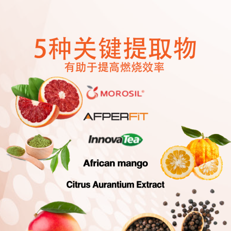 燃烧 - 用橙提取物、Morosill和AFPERFIT加速新陈代谢。两者共同作用,促进新陈代谢,加快能量代谢。