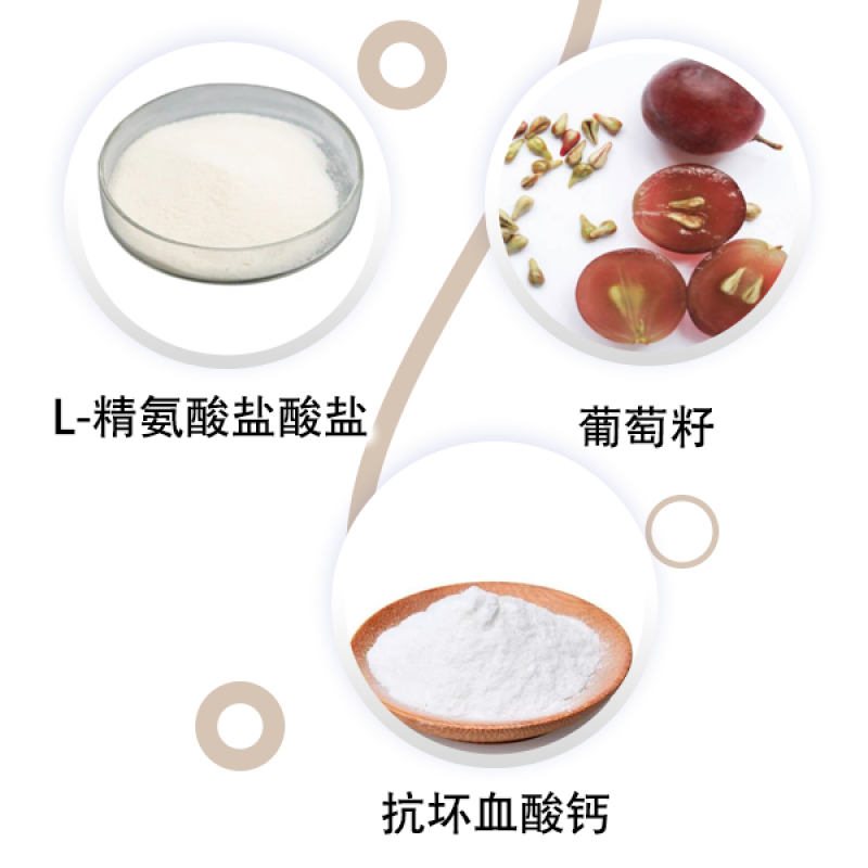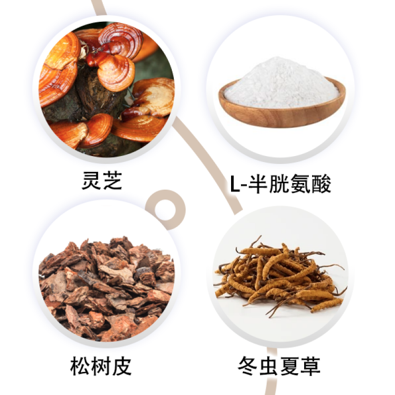 β-葡聚糖 300 毫克抗坏血酸钙 60 毫克 L-半胱氨酸 100 毫克冬虫夏草提取物 50 毫克 Hi Balanz Reishi提取物 60 毫克葡萄籽提取物 30 毫克人参提取物 60 毫克松树皮提取物 30 毫克 L-精氨酸盐酸盐 60 毫克