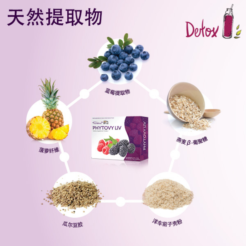 当肝脏受伤后,人体解毒能力下降,毒素和垃圾将会不断在体内积聚,尤其会影响内分泌系统,而 Phytovy Liv 正是肝病患者和嗜酒者的福音。因为它采用先进技术,能清除病毒和肝脏解毒,调节免疫功能,能迅速恢复过量饮酒后的肝功能。