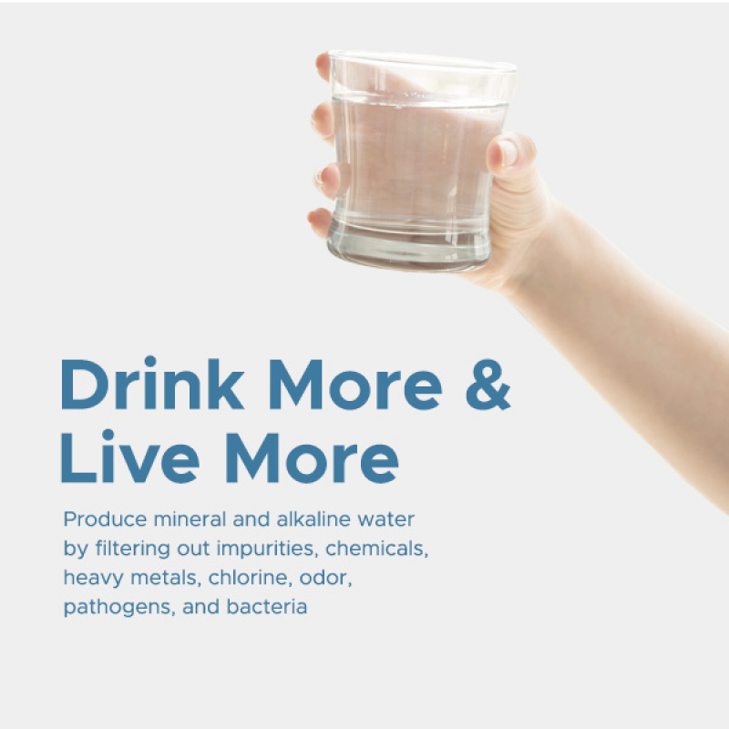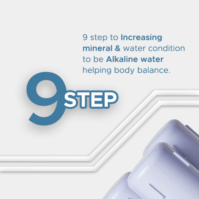 Alkamag has been developed to be more than just water filtration. It can produce mineral water and alkaline water in the same machine, called Mineral & Alkaline Water Purifier. It uses 9 steps of the filtration process to filter out impurities, chemicals, heavy metals, chlorine, odor, pathogens, and bacteria. This outstanding filtration process is utilized by the UF membrane with a resolution of 0.01 micron that inhibits the growth of bacteria and pathogens effectively.