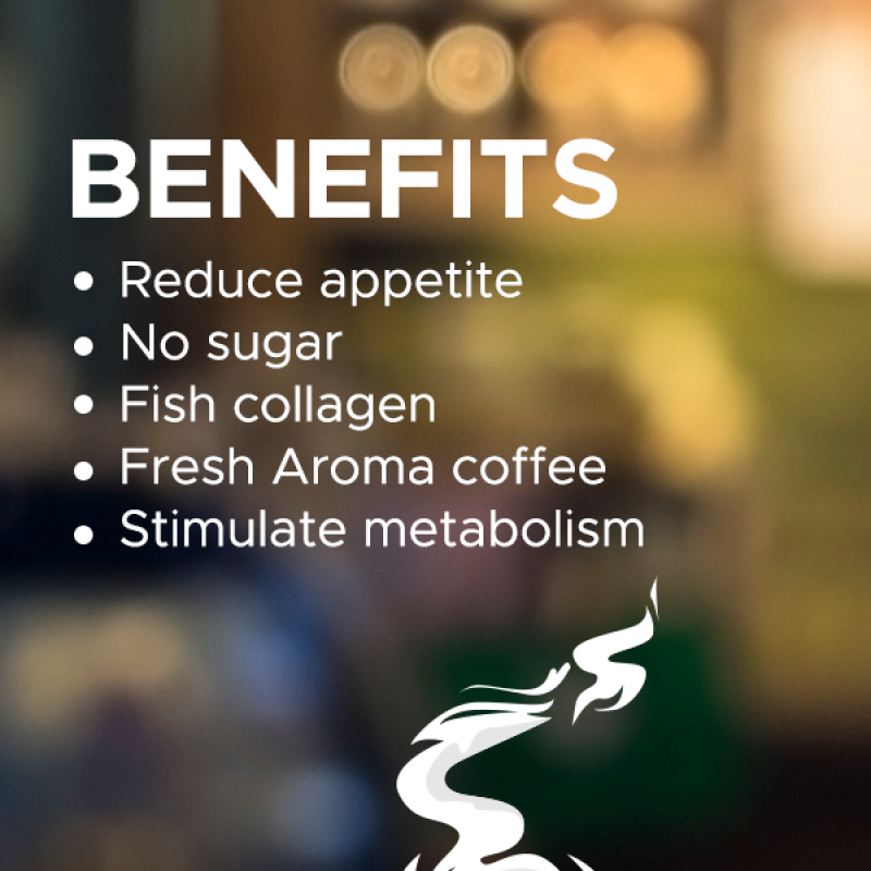 A coffee mixed with collagen and fiber with Arabica flavor. It's a healthy coffee with weight control and is made from marine fish collagen. It gives out a fresh coffee aroma that is different from those in the market, at the same time keeping its healthy values.