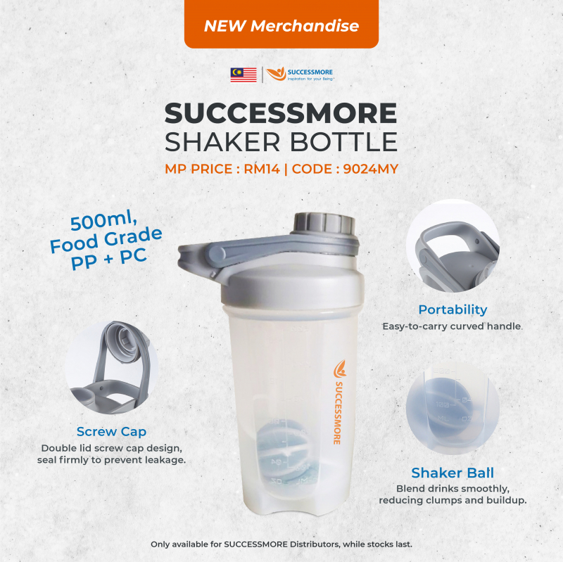 Botol Shaker Successmore Baharu, kapasiti 500ml, Gred Makanan Disahkan. Reka bentuk penutup skru penutup berganda membantu mengelak dengan selamat untuk mengelakkan kebocoran. Ia mempunyai pemegang melengkung untuk mudah dibawa. Ia juga termasuk bola shaker untuk membantu mengadun minuman dengan lancar, dengan itu mengurangkan gumpalan dan pembentukan. Item ini hanya RM14 sahaja! Masih belum terlambat untuk membelinya sekarang! Hanya tersedia untuk Pengedar Successmore sahaja, sementara stok masih ada.
