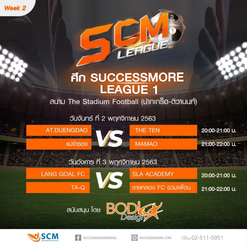ระเบิดศึกความมันส์ เต็มสูบ!! ใน SCM League วันจันทร์ที่ 2 พฤศจิกายน 2563 พบกับการดวลแข้งระหว่าง AT.DUENGDAO พบ THE TEN (20.00 – 21.00 น.) แม่จำรอง พบ MAMAO (21.00 – 22.00 น.) วันอังคาร ที่ 3 พฤศจิกายน 2563 พบ 2 คู่เดือด LANG GOAL FC ปะทะ SLA ACADEMY (20.00 – 21.00 น.) TA-Q พบกับ ชายคลอง FC รวมเพื่อน (21.00 – 22.00 น.)