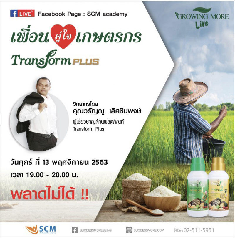 เผยทุกเคล็ดลับของการเพิ่มยอดขายจาก Transform Plus พร้อมเจาะลึกผลิตภัณฑ์ และแชร์ประสบการณ์ความสำเร็จจากผู้เชี่ยวชาญตัวจริง ในรายการ เพื่อนคู่ใจเกษตรกร Live โดย คุณวรัญญู เลิศชินพงษ์ ผู้เชี่ยวชาญด้านผลิตภัณฑ์ Transform Plus พบกัน ในวันศุกร์ ที่ 13 พฤศจิกายน 2563 เวลา 19.00 – 20.00 น. ณ สำนักงานใหญ่ รัชโยธิน ห้อง 301 พลาดไม่ได้!