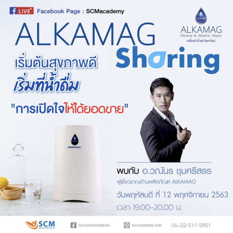 ปั้นยอดขาย ALKAMAG ให้ปัง! ด้วยเทคนิคสุดพิเศษ โดย อ.วณันร ชุมศรีสรร ผู้เชี่ยวชาญด้านผลิตภัณฑ์ ALKAMAG ในงาน ALKAMAG Sharing เริ่มต้นสุขภาพ เริ่มที่น้ำดื่ม ฟรีไม่มีค่าใช้จ่าย! ใน Faceboook : SCMacademy วันพฤหัสบดี ที่ 12 พฤศจิกายน 2563 เวลา 19.00 – 20.00 น.