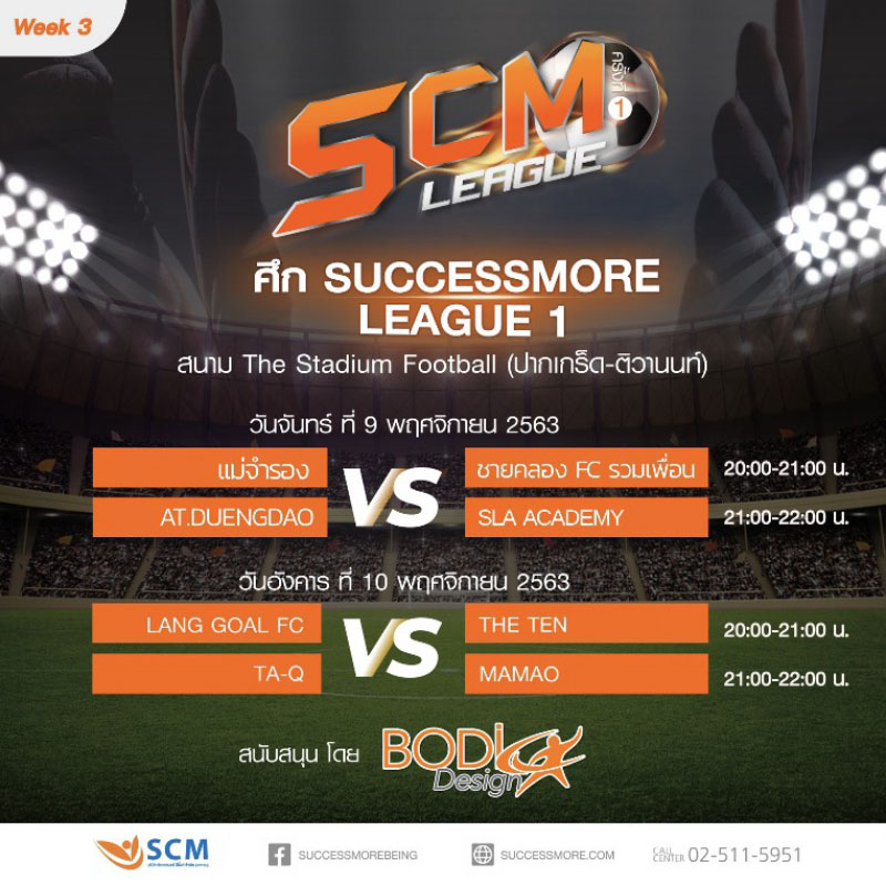 คู่เด็ดประจำสัปดาห์นี้!! วันจันทร์ ที่ 9 พฤศจิกายน 2563 พบความมันส์เต็มสูบ ระหว่าง แม่จำรอง ปะทะ ชายคลอง FC รวมเพื่อน (20.00 – 21.00 น.)AT.DUENGDAO พบ SLA ACADEMY (21.00 – 22.00 น.) วันอังคาร ที่ 10 พฤศจิกายน 2563 พบทัพความมันส์ LANG GOAL FC ปะทะ THE TEN (20.00 – 21.00 น.) TA-Q พบกับ MAMAO (21.00 – 22.00 น.)