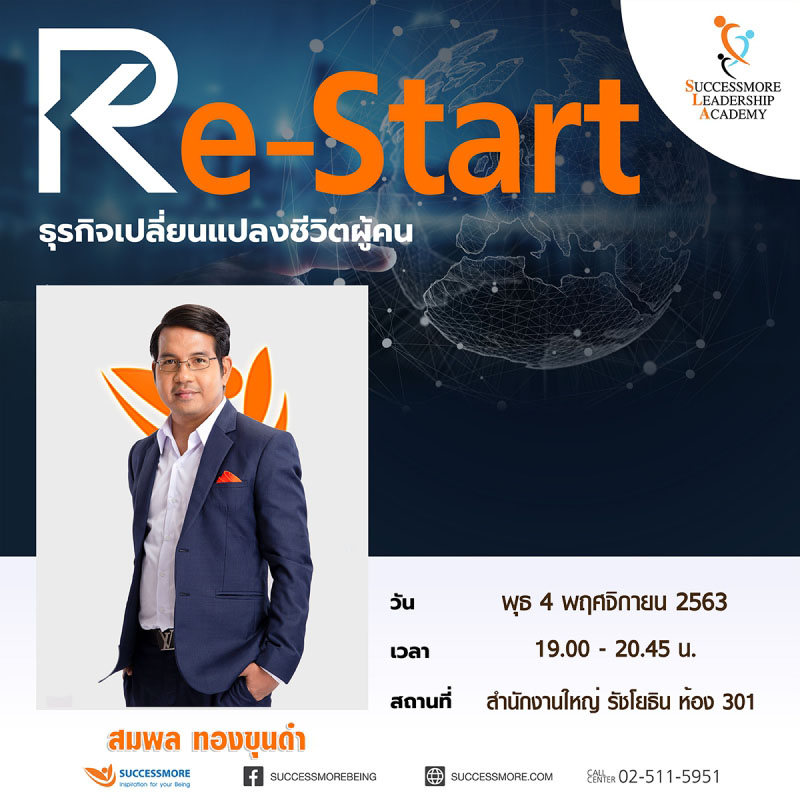 อัปเกรดศักยภาพ ติดอาวุธไปสู่เป้าหมายความสำเร็จ ไปพร้อมกันในงาน Re-Start ธุรกิจเปลี่ยนแปลงชีวิตผู้คน ร่วมรับฟังแนวทางไปสู่ความสำเร็จจากผู้นำตัวจริง จากนักธุรกิจที่ประสบความสำเร็จมาแล้วจริง คุณสมพล ทองขุนดำ วันพุธ ที่ 4 พฤศจิกายน 2563 เวลา 19.00 – 20.45 น. ณ สำนักงานใหญ่ รัชโยธิน (ห้อง 301)