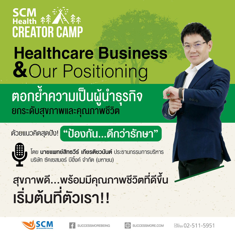 เตรียมตัวพบกับความรู้ดี ๆ และมุมมองการดูแลสุขภาพในรูปแบบที่คุณยังไม่เคยได้สัมผัส ในงาน SCM Health Creator Camp พร้อมกับการตอกย้ำความเป็นผู้นำธุรกิจยกระดับสุขภาพและคุณภาพชีวิต ในหัวข้อ Healthcare Business & Our Positioning ด้วยแนวคิดสุดปัง! “ป้องกัน…ดีกว่ารักษา” โดยนายแพทย์สิทธวีร์ เกียรติชวนันต์ ประธานกรรมการบริหาร บริษัท ซัคเซสมอร์ บีอิ้งค์ จำกัด (มหาชน) ไปพร้อมกันใน SCM Health Creator Camp ที่สุดของแคมป์สำหรับนักสร้างสรรค์สุขภาพ ที่จะสร้างให้คุณกลายเป็นผู้เชี่ยวชาญทางด้านการออกแบบสุขภาพ และยกระดับความสามารถในการไปสอนต่อเพื่อสร้างยอดธุรกิจให้เติบโตอย่างมืออาชีพ ณ โรงแรม ซันไรส์ลากูน โฮเทลแอนด์กอล์ฟ จ.ฉะเชิงเทรา สุขภาพดีพร้อมมีคุณภาพชีวิตที่ดีขึ้นเริ่มต้นที่ตัวเรา ด่วน! บัตรมีจำนวนจำกัด (เหลือเพียง 10 ที่นั่งเท่านั้น) จำหน่ายแล้วที่ SCM ทุกสาขา