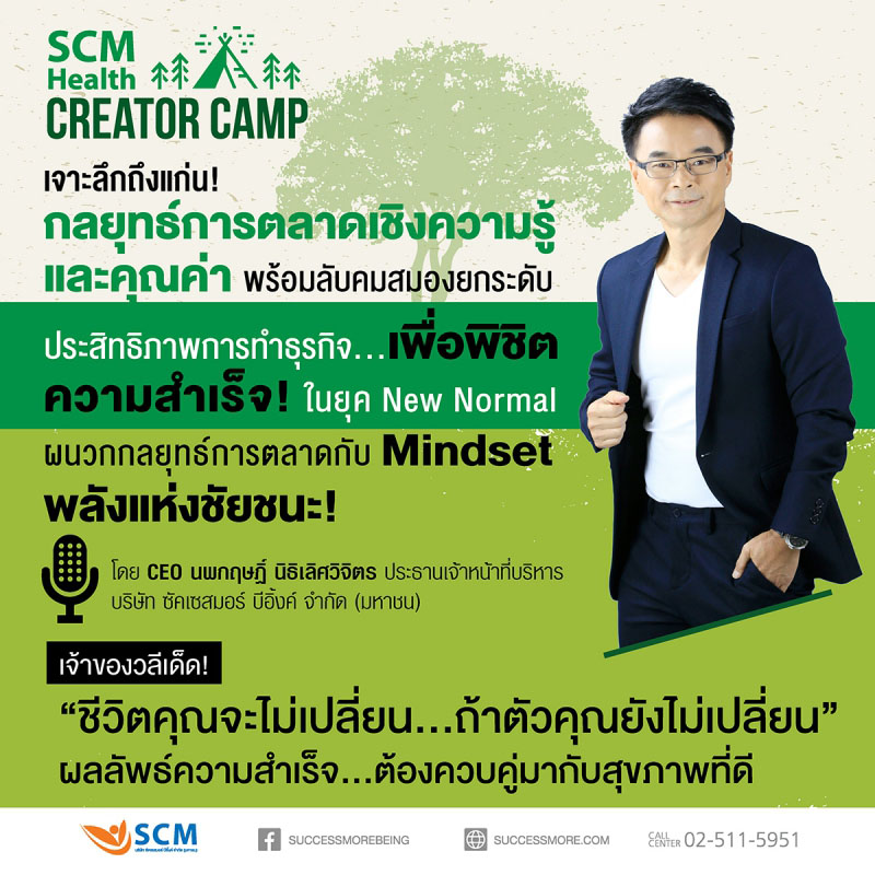โอกาสดี ๆ ที่ไม่ควรพลาด! กับการเจาะลึกถึงแก่นกลยุทธ์การตลาดเชิงความรู้และคุณค่า พร้อมลับคมสมองยกระดับประสิทธิภาพการทำธุรกิจ เพื่อพิชิตความสำเร็จในยุค New Normal ผนวกกลยุทธ์การตลาดกับ Mindset พลังแห่งชัยชนะ โดย CEO นพกฤษฏิ์ นิธิเลิศวิจิตร ประธานเจ้าหน้าที่บริหาร บริษัท ซัคเซสมอร์ บีอิ้งค์ จำกัด (มหาชน) เจ้าของวลีเด็ด! “ชีวิตคุณจะไม่เปลี่ยน ถ้าตัวคุณยังไม่เปลี่ยน” ใน SCM Health Creator Camp ที่สุดของแคมป์สำหรับนักสร้างสรรค์สุขภาพ ที่จะสร้างให้คุณกลายเป็นผู้เชี่ยวชาญทางด้านการออกแบบสุขภาพ และยกระดับความสามารถในการไปสอนต่อเพื่อสร้างยอดธุรกิจให้เติบโตอย่างมืออาชีพ ณ โรงแรม ซันไรส์ลากูน โฮเทลแอนด์กอล์ฟ จ.ฉะเชิงเทรา ด่วน! บัตรมีจำนวนจำกัด (เหลือเพียง 10 ที่นั่งเท่านั้น) จำหน่ายแล้วที่ SCM ทุกสาขา ผลลัพธ์ความสำเร็จ…ต้องควบคู่มากับสุขภาพที่ดี พบคำตอบสุขภาพดีจะพาคุณไปสู่ความสำเร็จได้อย่างไร ที่นี่สมัครเลย!