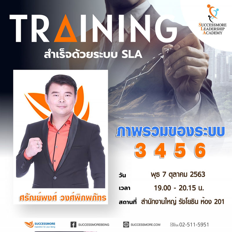 เพิ่มศักยภาพในตัวคุณ!! กับที่สุดของงานอบรม TRAINING สำเร็จด้วยระบบ SLA โดย คุณศรัณย์พงศ์ วงศ์พิภพภัทร ที่จะมาเสริมศักยภาพและสร้างฝันของคุณให้เป็นจริง เพื่อก้าวสู่ความความสำเร็จ ในหัวข้อ “ภาพรวมของระบบ 3 4 5 6” วันพุธ ที่ 7 ตุลาคม 2563 เวลา 19.00 – 20.15 น. ณ สำนักงานใหญ่ รัชโยธิน (ห้อง 201)
