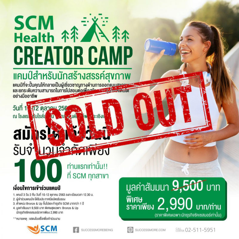 กระแสตอบรับดีเกินคาด!! สำหรับ SCM Health Creator Camp แคมป์สำหรับนักสร้างสรรคสุขภาพ ได้ Sold Out เป็นที่เรียบร้อย SCM ขอขอบคุณทุกผลตอบรับที่ดีเยี่ยม แล้วพบกันในวันที่ 10 – 12 ตุลาคม 2563 นี้