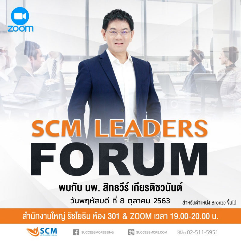 อยากเป็นผู้นำที่ดี ต้องไม่พลาด!! SCM LEADERS FORUM สุดยอดงานประชุมระดับผู้นำ (สำหรับตำแหน่ง Bronze ขึ้นไป) พบกับผู้บริหารคนดัง นายแพทย์ สิทธวีร์ เกียรติชวนันต์ ประธานกรรมการบริหาร SCM ที่จะมาแนะนำเคล็บลับในการพัฒนาศักยภาพความเป็นผู้นำในตัวคุณ ในหัวข้อ “Be a Good Leadership Role Model” จงเป็นผู้นำ ผู้เป็นต้นแบบ วันพฤหัสบดี ที่ 8 ตุลาคม 2563 เวลา 19.00 – 20.00 น. สำนักงานใหญ่ รัชโยธิน (ห้อง 301) ต่างจังหวัดสามารถรับชมผ่านช่องทางแอปพลิเคชั่น ZOOM