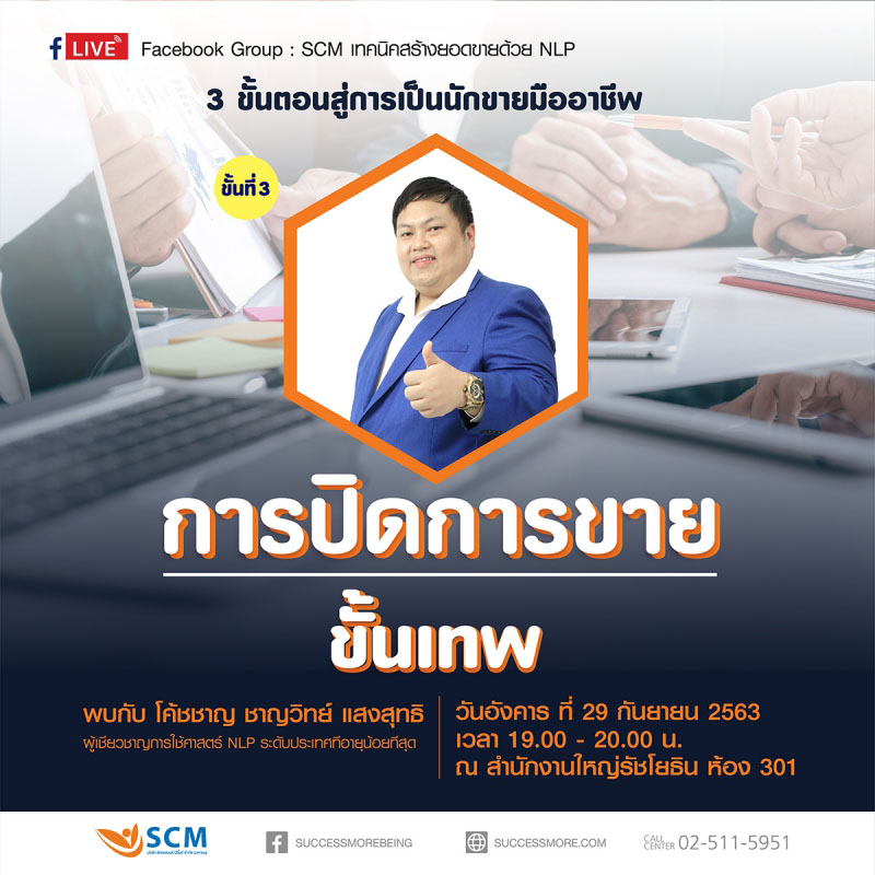 พลาดไม่ได้!! กับเทคนิคสร้างยอดขายด้วย NLP พบกับ EP.3 สุดท้าย “การปิดการขายขั้นเทพ” เทคนิคการปิดจ๊อบแบบมืออาชีพ โดย โค้ชชาญ-ชาญวิทย์ แสงสุทธิ ผู้เชี่ยวชาญการใช้ศาสตร์ NLP ระดับประเทศที่อายุน้อยที่สุด วันอังคาร ที่ 29 กันยายน 2563 เวลา 19.00 -20.00 น. ณ สำนักงานใหญ่ (รัชโยธิน) ห้อง 301 ฟรี!!สำรองที่นั่งได้ที่ Call Center : 02-511-5951 สำหรับต่างจังหวัดรับชมผ่าน Facebook Group (กลุ่มปิด) : SCM เทคนิคการสร้างยอดขายด้วย NLP
