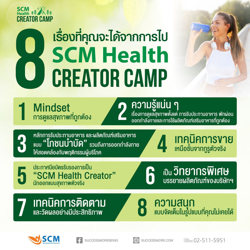 ใครจะไปยกมือขึ้น…! กับทริป SCM Health Creator Camp ณ โรงแรม ซันไรส์ลากูน โฮเทลแอนด์กอล์ฟ จ.ฉะเชิงเทรา แคมป์สำหรับนักสร้างสรรค์สุขภาพ ที่จะสร้างให้คุณกลายเป็นผู้เชี่ยวชาญทางด้านการออกแบบสุขภาพ และยกระดับความสามารถในการไปสอนต่อเพื่อสร้างยอดธุรกิจให้เติบโตอย่างมืออาชีพ หากว่าคุณเกิดความลังเล เรามี 8 เรื่องที่คุณจะได้รับจาก “SCM Health Creator Camp” มาเล่าให้ฟัง !!! งานนี้เรียกว่าคุ้มสุด ๆ พลาดแล้วจะเสียใจ ด่วน!! บัตรมีจำนวนจำกัด เพียง 100 ท่านเท่านั้น จำหน่ายแล้วที่ SCM ทุกสาขา เงื่อนไขการเข้าร่วมแคมป์