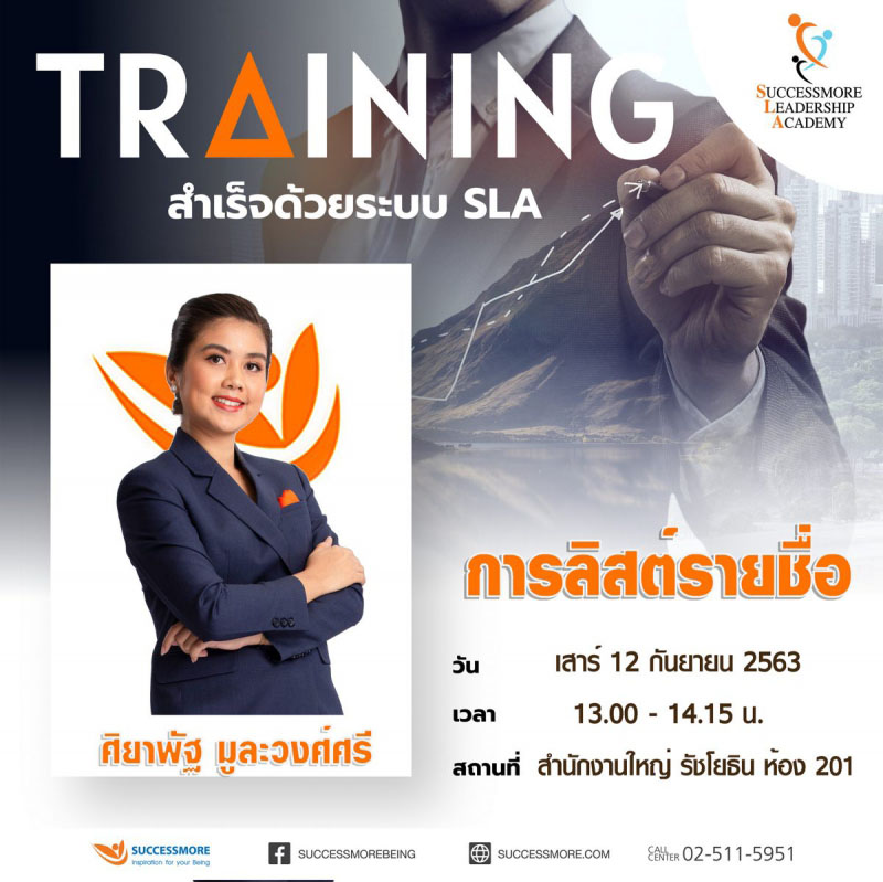 พบกับ TRAINING สำเร็จด้วยระบบ SLA งานอบรมที่จะมาเสริมศักยภาพและสร้างฝันของคุณให้เป็นจริง เพื่อก้าวสู่ความสำเร็จจากผู้สำเร็จจริง โดย คุณศิยาพัฐ มูละวงศ์ศรี สุดยอดผู้นำคนเก่ง ที่จะมาแชร์ประสบการณ์ พร้อมเผยเคล็ดลับ ในหัวข้อ “การลิสต์รายชื่อ” ทำอย่างไรถึงจะลิสต์รายชื่อได้อย่างมีประสิทธิภาพ วันเสาร์ ที่ 12 กันยายน 2563 เวลา 13.00 – 14.15 น. ณ สำนักงานใหญ่ (รัชโยธิน) ห้อง 201