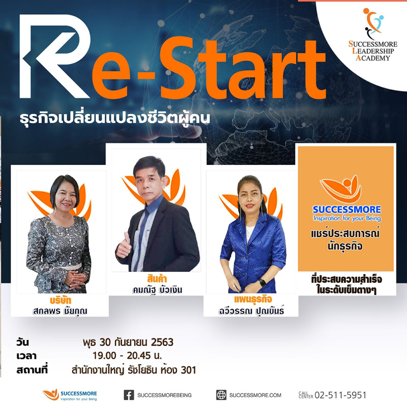Re-Start ธุรกิจเปลี่ยนแปลงชีวิตผู้คน พบกับนักธุรกิจตัวจริงเสียงจริง ที่ประสบความสำเร็จมาแล้วในระดับเข็มต่าง ๆ โดย 3 ผู้นำ ที่จะมาแชร์ประสบการณ์และเคล็ดลับต่างๆ ในการทำธุรกิจให้ประสบความสำเร็จคุณสกลพร ชัยกุณ คุณคมณัฐ บัวเงิน คุณฉวีวรรณ ปุณขันธ์ในวันพุธ ที่ 30 กันยายน 2563 เวลา 19.00 – 20.45 น. ณ สำนักงานใหญ่ รัชโยธิน (ห้อง 301)