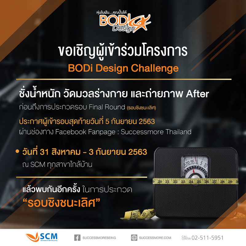 โค้งสุดท้าย BODi Design Challenge การประกวดปั้นหุ่นสุดท้าทายแห่งปี ขอเชิญผู้เข้าร่วมโครงการ BODi Design Challenge ทุกท่าน มาชั่งน้ำหนัก วัดมวลร่างกาย และถ่ายภาพ After ก่อนถึงการประกวดรอบ Final Round (รอบชิงชนะเลิศ) ในวันที่ 31 สิงหาคม – 3 กันยายน 2563 ณ SCM ทุกสาขาใกล้บ้าน แล้วพบกันอีกครั้ง ในการประกวด “รอบชิงชนะเลิศ”