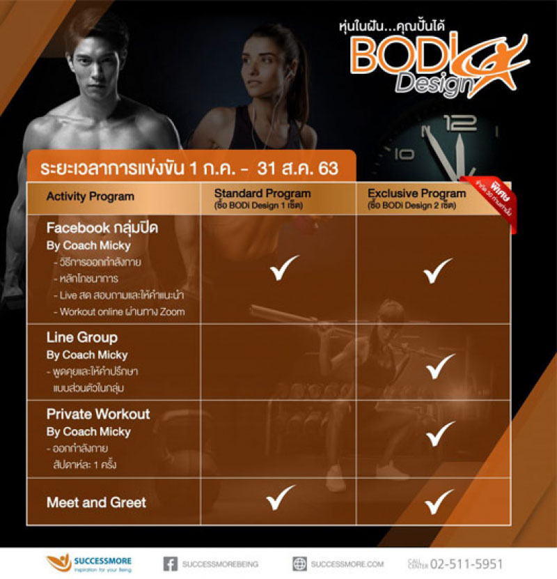 สิ่งที่คุณจะได้รับจาก โปรแกรม BODi Design แบบ Standard Program และ Exclusive Program Standard Program เข้าร่วม Facebook กลุ่มปิด สอนวิธีการออกกำลังกาย หลักโภชนาการ ชม Live สด และ ออกกำลังกายร่วมกับโค้ชมิกกี้ผ่าน Zoom เข้าร่วมงาน Meet and Greet ทำกิจกรรมกับโค้ชมิกกี้ Exclusive Program เข้าร่วม Facebook กลุ่มปิด สอนวิธีการออกกำลังกาย หลักโภชนาการ ชม Live สด และ ออกกำลังกายร่วมกับโค้ชมิกกี้ผ่าน Zoom เข้าร่วม Line Group เพื่อพูดคุยและให้คำปรึกษาเกี่ยวกับโภชนาการและการออกกำลังกายแบบส่วนตัวกับโค้ชมิกกี้ ออกกำลังกายร่วมกับโค้ชมิกกี้สัปดาห์ละ 1 ครั้งเข้าร่วมงาน Meet and Greet ทำกิจกรรมกับโค้ชมิกกี้