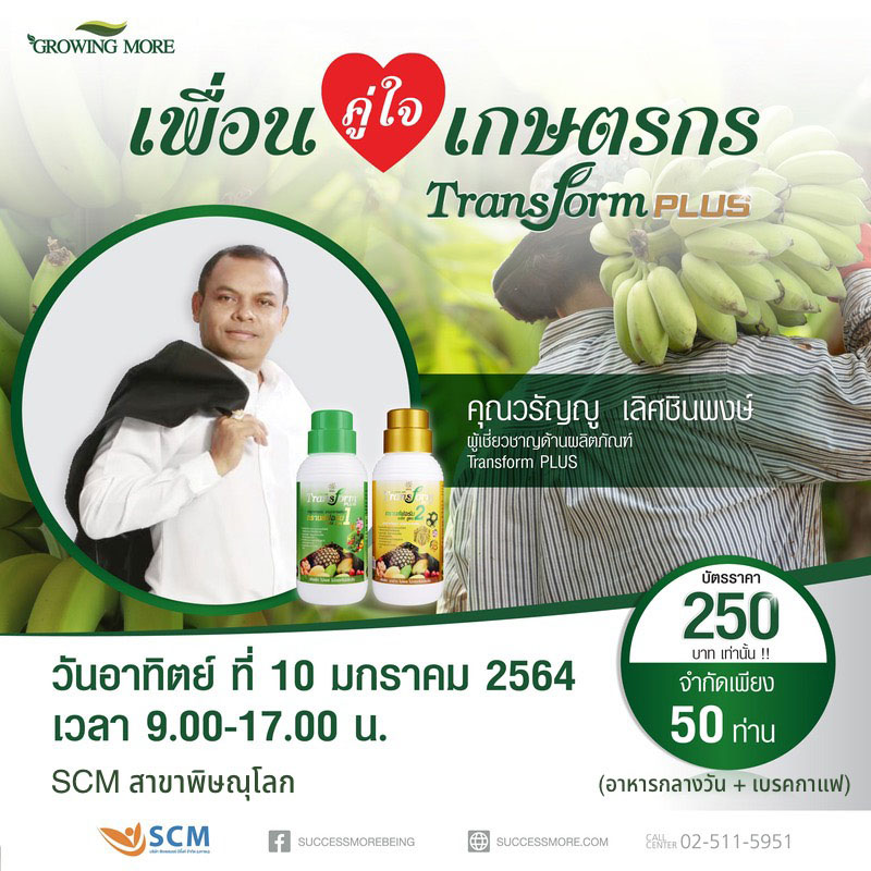 เพื่อนคู่ใจเกษตรกร Transform Plus ให้ชาวซัคเซสมอร์พิษณุโลกรับฟังข้อมูลดีๆในการเพิ่มผลิตผลทางการเกษตร จากผู้เชี่ยวชาญด้านผลิตภัณฑ์โดยตรง คุณวรัญญู เลิศชินพงษ์ พร้อมแนะนำเทคนิคที่จะช่วยเกษตรกร เพิ่มมูลค่าพืชผล ทวีคูณกำไร x2 ห้ามพลาด!! วันอาทิตย์ที่ 10 มกราคม 2564 เวลา 9.00-17.00 น. ณ SCM สาขาพิษณุโลก บัตรราคา 250 บาท จำนวนจำกัดเพียง 50 ท่านเท่านั้น!!! โอกาสดีๆ แบบนี้ รอช้าไม่ได้แล้ว