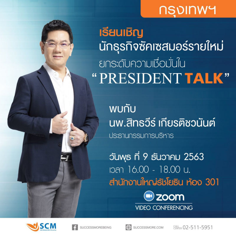 เตรียมพบกับสุดยอดงานแห่งการยกระดับความเชื่อมั่น President Talk งานที่อัปเกรดความพร้อมในเส้นทางแห่งความสำเร็จ โดย นายแพทย์ สิทธวีร์ เกียรติชวนันต์ ประธานกรรมการบริหาร ผู้ที่จะมายกระดับความเชื่อมั่น และอัปเกรดความพร้อมให้แก่นักธุรกิจรายใหม่เพื่อก้าวไปอย่างมั่นคงในเส้นทางแห่งความสำเร็จ ที่ชื่อว่า Successmore ในวันพุธ ที่ 9 ธันวาคม 2563 เวลา 16.00 – 18.00 น. ณ สำนักงานใหญ่รัชโยธิน ห้อง 301 และรับชมผ่าน ZOOM