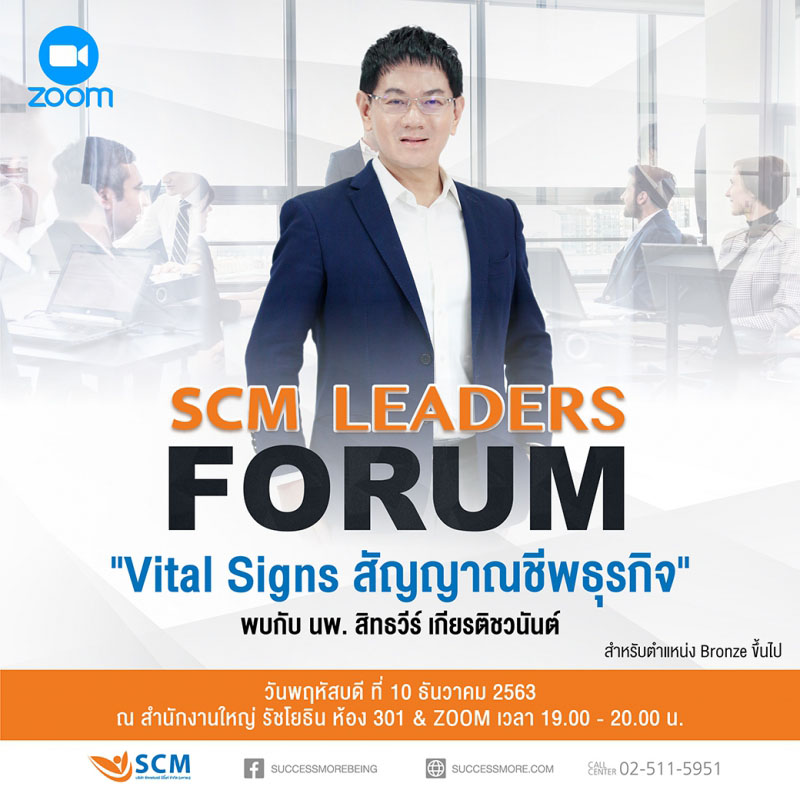 อีกครั้งกับงานประชุมสุดยอดผู้นำ SCM LEADERS FORUM ที่ช่วยยกระดับศักยภาพความสามารถ และการพัฒนาตนเพื่อเดินทางไปสู่เส้นทางแห่งความสำเร็จ ครั้งนี้หนึ่งในสุดยอดผู้นำของชาวซัคเซสมอร์ นายแพทย์ สิทธวีร์ เกียรติชวนันต์ มาบอกเล่าเรื่องราวในหัวข้อ “Vital Signs สัญญาณชีพธุรกิจ” ร่วมเรียนรู้การจับสัญญาณชีพธุรกิจ เพื่อวิเคราะห์หาจุดอ่อน และกำจัดอุปสรรคที่อาจเกิดขึ้น เพื่อก้าวสู่ความสำเร็จ พัฒนาศักยภาพตนเองไปอีกขั้น!! พิเศษสำหรับนักธุรกิจตำแหน่ง BRONZE ขึ้นไปเท่านั้น ห้ามพลาด!! วันพฤหัสบดีที่ 10 ธันวาคม 2563 ณ สำนักงานใหญ่ รัชโยธิน ห้อง 301 และต่างจังหวัดรับชมผ่าน ZOOM เวลา 19.00-20.00 น.