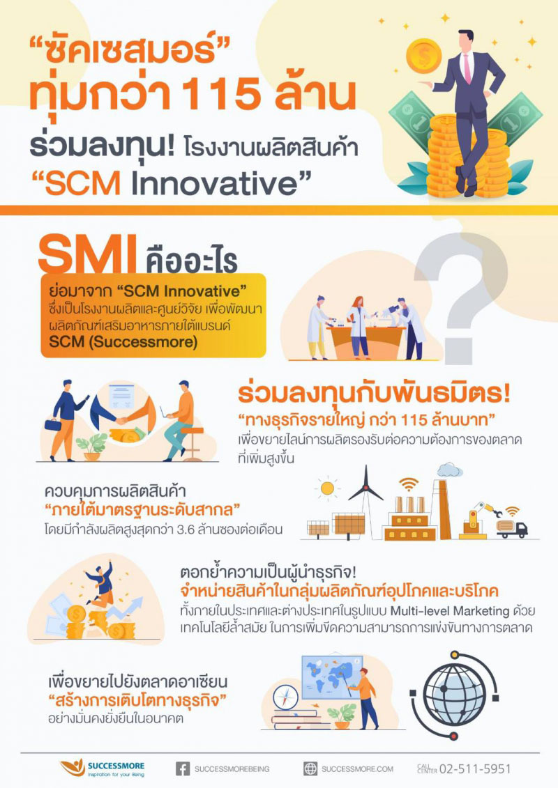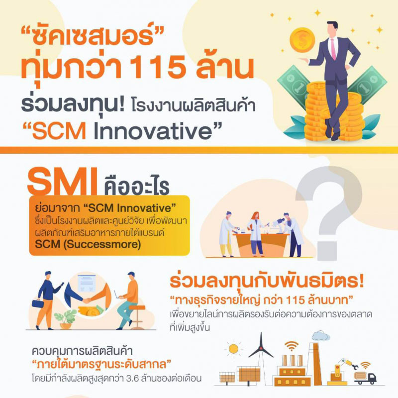 เป็นนักธุรกิจซัคเซสมอร์ ไม่รู้เรื่องนี้ไม่ได้!! กับคำถามที่ว่า SMI คืออะไร ตามมาดูคำตอบไปพร้อมกันได้เลย ซัคเซสมอร์ เดินหน้ากับพันธมิตรร่วมลงทุนโรงงาน มุ่งมั่นผลิตสินค้าภายใต้มาตรฐานระดับสากลในชื่อ SMI ย่อมาจาก SCM Innovative ซึ่งเป็นโรงงานผลิตและศูนย์วิจัย เพื่อพัฒนาผลิตภัณฑ์เสริมอาหารภายใต้แบรนด์ SCM (Successmore) โดยร่วมลงทุนกับพันธมิตรทางธุรกิจรายใหญ่กว่า 115 ล้านบาท เพื่อขยายไลน์การผลิตรองรับต่อความต้องการของตลาดทั้งในและต่างประเทศที่เพิ่มสูงขึ้น ด้วยกำลังการผลิต 3.6 ล้านซอง เพื่อสร้างการเติบโตทางธุรกิจอย่างมั่นคงและยั่งยืน