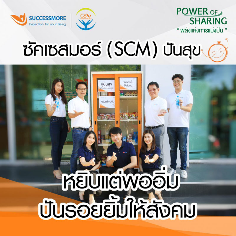 ขอเชิญนักธุรกิจทุกท่าน ร่วมแบ่งปันน้ำใจในโครงการ ซัคเซสมอร์ (SCM) ปันสุข หยิบแต่พออิ่ม ปันรอยยิ้มให้สังคม ภายใต้แนวความคิด The Power Of Sharing “พลังแห่งการแบ่งปัน” โดยท่านสามารถนำอาหารแห้ง อาหารกึ่งสำเร็จรูป เครื่องดื่ม และของใช้จำเป็นมาใส่ในตู้ซัคเซสมอร์ (SCM) ปันสุขได้ เพื่อแบ่งปันน้ำใจให้แก่ผู้ยากไร้ในชุมชนรอบ ๆ บริษัทฯ และช่วยเหลือประชาชนที่ได้รับความเดือดร้อนจากผลกระทบของการแพร่ระบาดโควิด-19 (COVID-19) ทั้งนี้ตู้ซัคเซสมอร์ (SCM) ปันสุข จะตั้งอยู่ที่บริเวณหน้าสำนักงานใหญ่ รัชโยธิน และสาขาต่างจังหวัด ได้แก่ เชียงใหม่ พิษณุโลก นครศรีธรรมราช สุราษฎร์ธานี นครสวรรค์ และหาดใหญ่