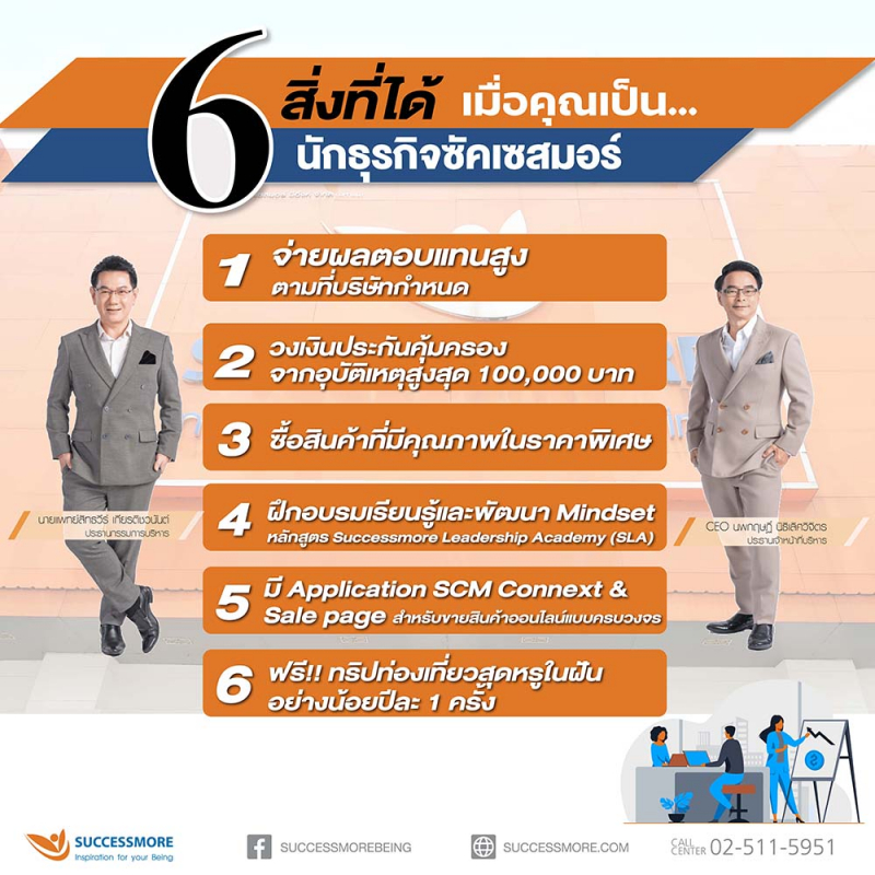 สนใจสมัครเป็นนักธุรกิจซัคเซสมอร์ โทร. 0-2511-5955 และ 0-2511-5951