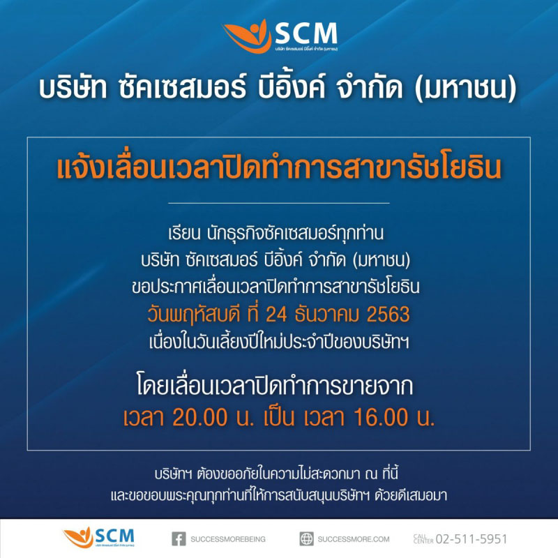 ประกาศ!! แจ้งเลื่อนเวลาปิดการให้บริการสาขารัชโยธิน เรียน นักธุรกิจซัคเซสมอร์ทุกท่าน บริษัท ซัคเซสมอร์ บีอิ้งค์ จำกัด (มหาชน) ขอประกาศเลื่อนเวลาปิดการให้บริการของสาขารัชโยธิน ในวันพฤหัสบดี ที่ 24 ธันวาคม 2563 เนื่องในวันเลี้ยงปีใหม่ของบริษัท ประจำปี 2563 โดยขอเลื่อนเวลาปิด ให้บริการเร็วขึ้นจากเดิม เวลา 20.00 น. เป็น เวลา 16.00 น. บริษัทฯ ต้องขออภัยในความไม่สะดวกมา ณ ที่นี้ และขอขอบพระคุณทุกท่านที่ให้การสนับสนุนบริษัทฯ ด้วยดีเสมอมา