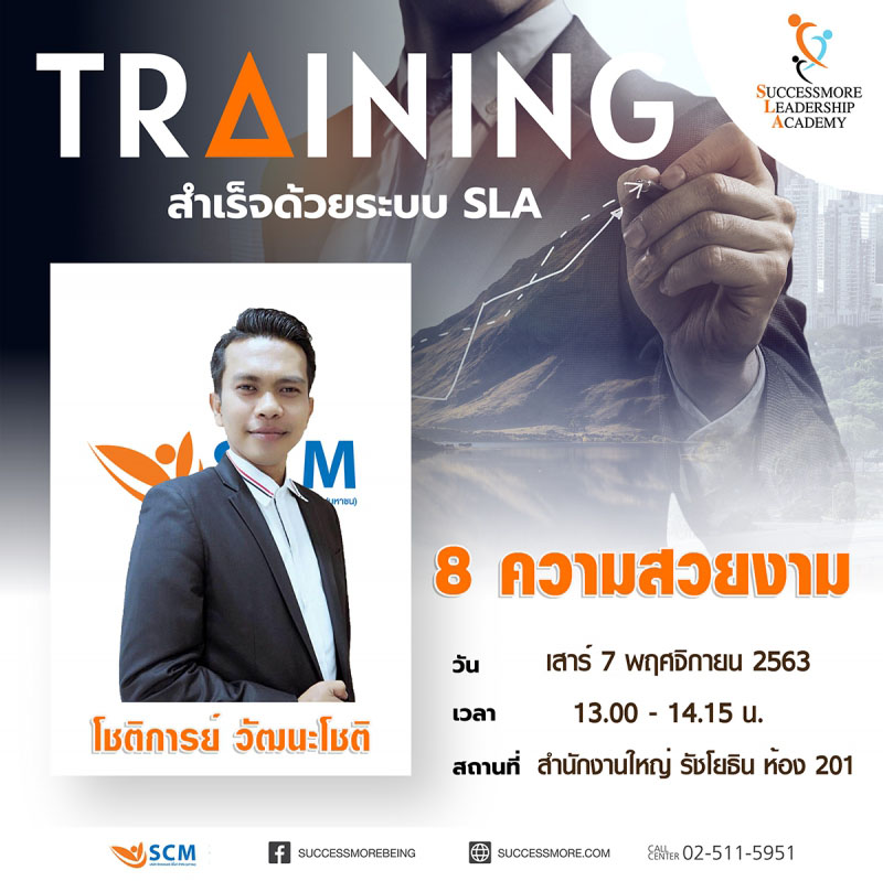 เพิ่มความมั่นใจเพื่อก้าวไปสู่ความสำเร็จอย่างมั่นคง ไปด้วยกันในงาน TRAINING สำเร็จด้วยระบบ SLA ในหัวข้อ “8 ความสวยงาม” โดย คุณโชติการย์ วัฒนะโชติ วันเสาร์ ที่ 7 พฤศจิกายน 2563 เวลา 13.00 – 14.15 น. ณ สำนักงานใหญ่ (รัชโยธิน) ห้อง 201
