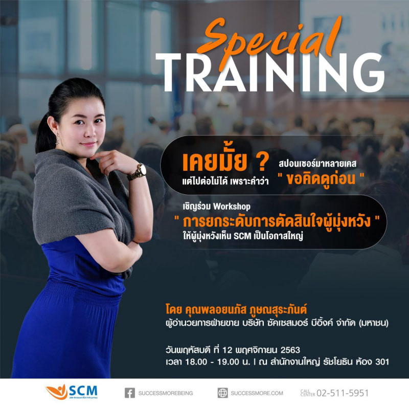 เคยมั๊ย? สปอนเซอร์มาหลายเคส แต่ไปต่อไม่ได้ เพราะคำว่า “ขอคิดดูก่อน” หากคำตอบนี้คือ ปัญหาของคุณ.. มาพบกันใน Special Training ร่วมทำ Workshop “การยกระดับการตัดสินใจผู้มุ่งหวัง” ปล่อยหมัดเด็ด เพื่อให้ผู้มุ่งหวัง เห็น SCM เป็นโอกาสใหญ่ และ เลือก SCM เป็นยานพาหนะหลัก ในการเปลี่ยนแปลงชีวิต… โดยกูรูผู้เชี่ยวชาญ ด้านจิตวิทยา MLM คุณพลอยนภัส ภูษณสุระภันต์ ผู้อำนวยการฝ่ายขาย บริษัท ซัคเซสมอร์ บีอิ้งค์ จำกัด (มหาชน) พลาดไม่ได้! วันพฤหัสบดี ที่ 12 พฤศจิกายน 2563 เวลา 18.00 – 19.00 น. ณ สำนักงานใหญ่ รัชโยธิน