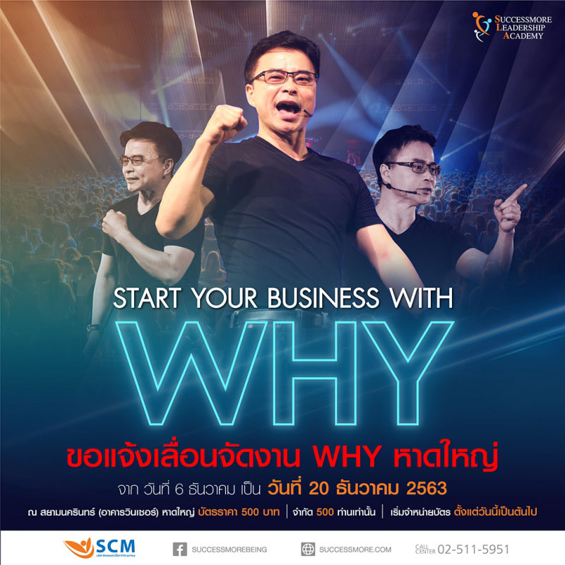 ประกาศเลื่อนการจัดงานสัมมนาสุดยิ่งใหญ่ WHY หาดใหญ่จาก วันที่ 6 ธันวาคม 2563 เป็น วันที่ 20 ธันวาคม 2563 เวลา 8:00 – 17:00 น. ร่วมมาเป็นส่วนหนึ่งของงานสัมมนาสุดอลังกาล จุดประกายไฟ พร้อมระเบิดพลัง และแรงบันดาลใจในวันที่ 20 ธันวาคม 2563 ได้ที่งาน Start Your Business With WHY by CEO นพกฤษฏิ์ นิธิเลิศวิจิตร ณ สยามนครินทร์ (อาคารวินเซอร์) หาดใหญ่ขออภัยในความไม่สะดวก