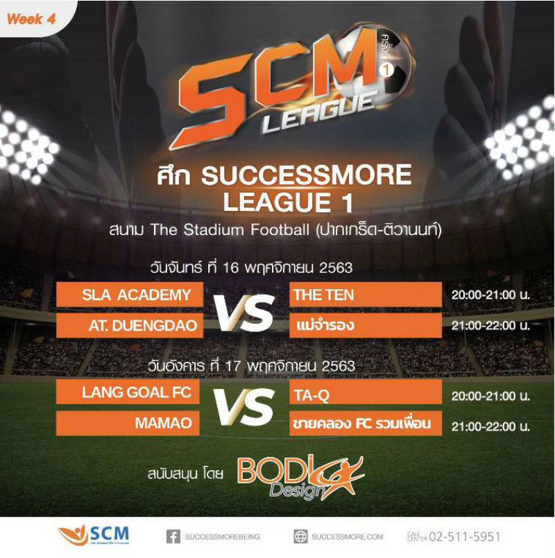 SCM League แมตช์สุดมันส์สัปดาห์นี้!! วันจันทร์ ที่ 16 พฤศจิกายน 2563 พบความมันส์ ระหว่าง SLA ACADEMY พบ THE TEN (20.00 – 21.00 น.) AT.DUENGDAI พบ แม่จำรอง (21.00 – 22.00 น.) วันอังคาร ที่ 17 พฤศจิกายน 2563 พบทัพความมันส์ LANG GOAL FC ปะทะ TA-Q (20.00 – 21.00 น.) MAMAO พบกับ ชายคลอง FC รวมเพื่อน (21.00 – 22.00 น.)