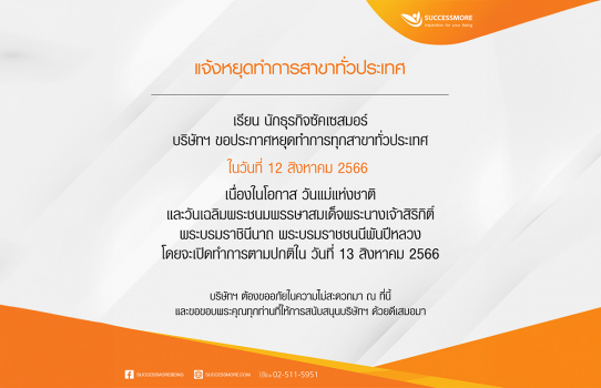 บริษัทฯ ขอประกาศหยุดทำการทุกสาขาทั่วประเทศ 12 สิงหาคม 2566 เนื่องในโอกาส วันแม่แห่งชาติ