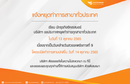 บริษัทฯ ขอประกาศหยุดทำการทุกสาขาทั่วประเทศ ในวันพฤหัสบดีที่ 13 ตุลาคม 2565
