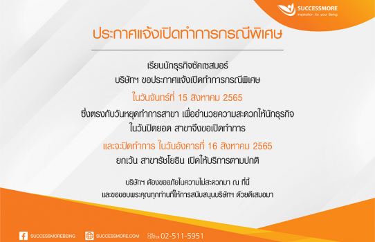 แจ้งเปิดทำการกรณีพิเศษใน วันจันทร์ที่ 15 สิงหาคม 2565
