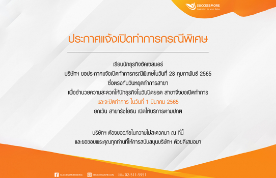 บริษัทฯ แจ้งเปิดทำการกรณีพิเศษ ในวันจันทร์ ที่ 28 กุมภาพันธ์ 2565