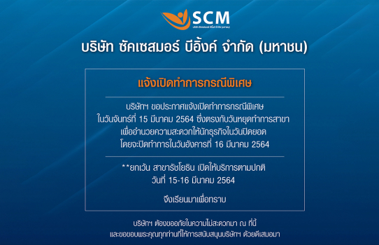 บริษัทฯ ขอประกาศแจ้งเปิดทำการกรณีพิเศษในวันจันทร์ที่ 15 มีนาคม 2564 ซึ่งตรงกับวันหยุดทำการสาขา
